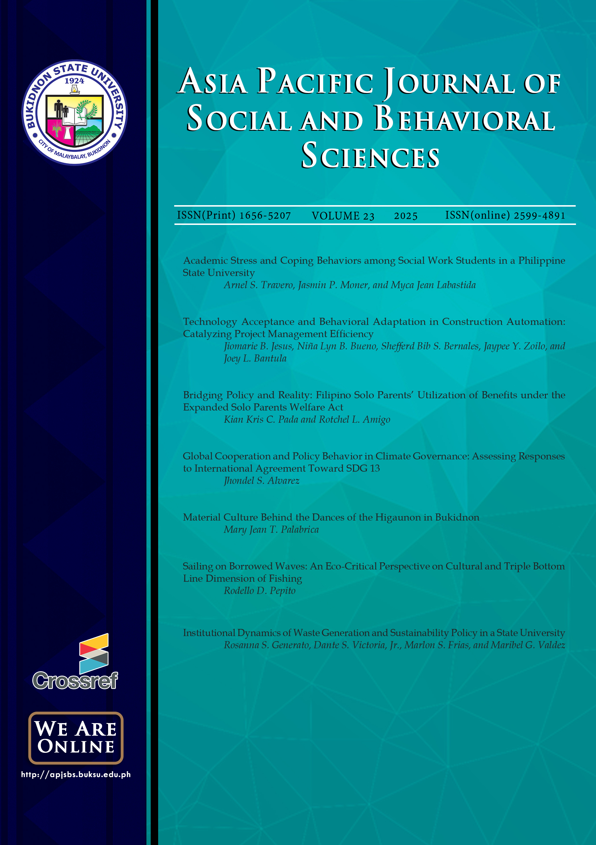 Vol 23 (2025)This Regular Issue, Volume 23 of the Asia Pacific Journal of Social and Behavioral Sciences features a diverse collection of peer-reviewed articles that examine contemporary social, behavioral, cultural, technological, and environmental concerns within the Asia-Pacific region and beyond. The issue reflects the journal’s sustained commitment to interdisciplinary scholarship that bridges theory, empirical inquiry, and policy-relevant insights. The volume opens with an investigation into academic stress and coping behaviors among social work students in a Philippine state university, highlighting mental health challenges in higher education and the adaptive responses of future social service professionals. This is followed by a study on technology acceptance and behavioral adaptation in construction automation, which illustrates how innovation reshapes professional practices and enhances project management efficiency. Social policy implementation is critically examined in the article on Filipino solo parents’ utilization of benefits under the Expanded Solo Parents Welfare Act, revealing gaps between legislative frameworks and lived realities. At the global level, an analysis of international cooperation and policy behavior in climate governance assesses national responses to global agreements in advancing Sustainable Development Goal 13. Cultural and environmental perspectives are foregrounded in a study on the material culture behind the dances of the Higaunon in Bukidnon, which documents indigenous knowledge, identity, and heritage through embodied practices. An eco-critical examination of fishing practices further explores sustainability by integrating cultural meanings and the triple bottom line framework. The issue concludes with an institutional analysis of waste generation and sustainability policy in a state university in the Philippines, emphasizing the role of higher education institutions in shaping sustainable behaviors. Together, the articles contribute meaningful insights to ongoing discussions on social development, governance, sustainability, and cultural preservation. -