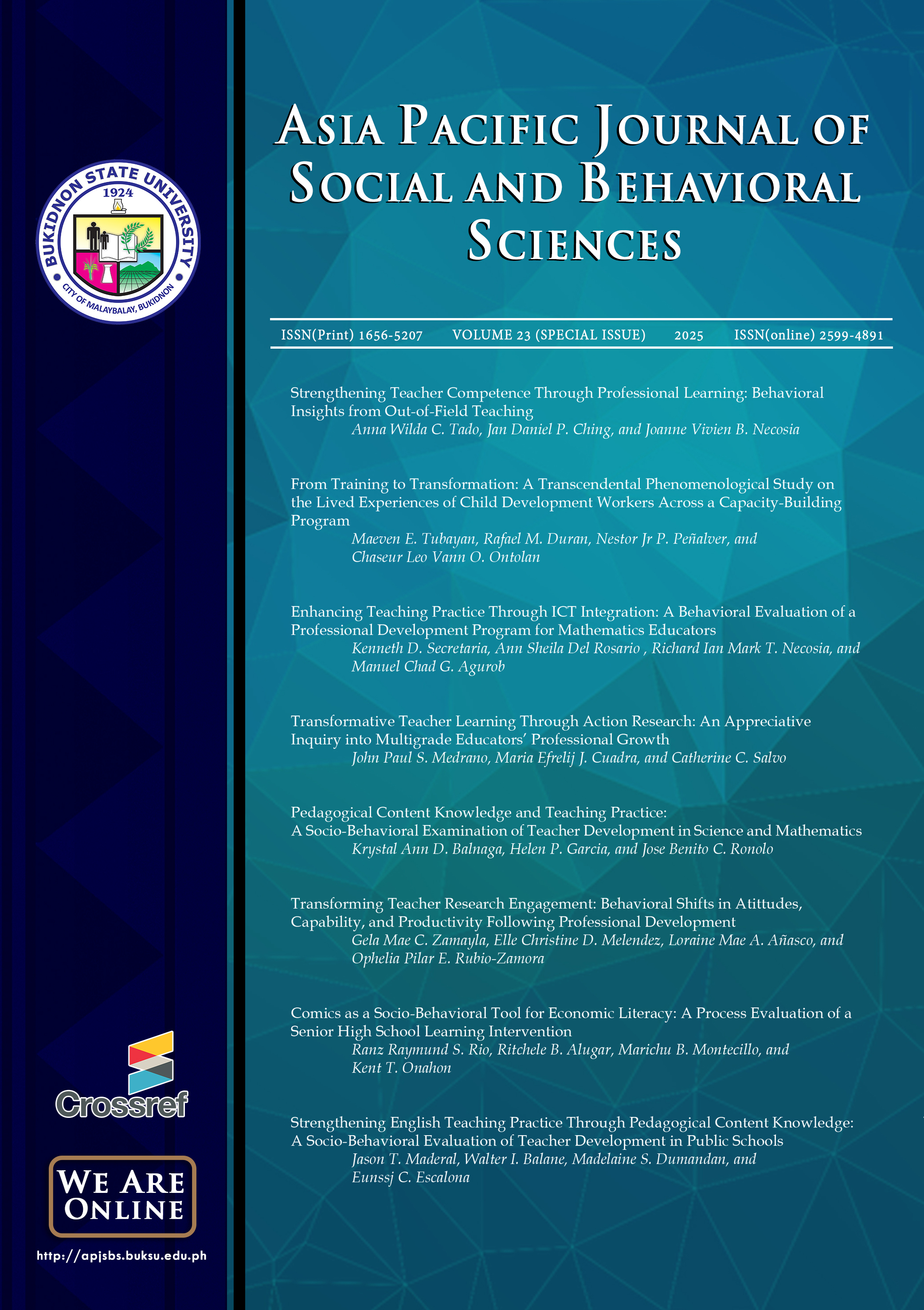 Vol 23 (2025)The Asia Pacific Journal of Social and Behavioral Sciences, Volume 23, features a Special Issue that foregrounds teacher competence and professional learning as central concerns in contemporary education. Bringing together empirically grounded and practice-oriented studies, the issue examines how professional development initiatives influence teachers’ knowledge, behaviors, and instructional practices across diverse educational contexts. Anchored in socio-behavioral perspectives, the contributions frame professional learning as a dynamic and transformative process rather than a one-off training activity. The articles explore varied settings, including out-of-field teaching, child development programs, multigrade classrooms, and public-school environments, highlighting how educators experience, negotiate, and sustain professional growth. Key themes across the issue include the integration of ICT in teaching, the use of action research as a vehicle for reflective practice, and the development of pedagogical content knowledge in science, mathematics, and English education. Several studies also investigate changes in teacher research engagement, documenting behavioral shifts in attitudes, capability, and productivity following targeted professional development. Innovative instructional approaches, such as the use of comics as a socio-behavioral tool for economic literacy, further demonstrate how professional learning can translate into effective and context-sensitive classroom practice. Overall, this Special Issue advances a cohesive body of evidence in ongoing discussions on teacher development, offering insights for educators, school leaders, and policymakers seeking to strengthen teaching quality through sustained and context-responsive professional learning. -